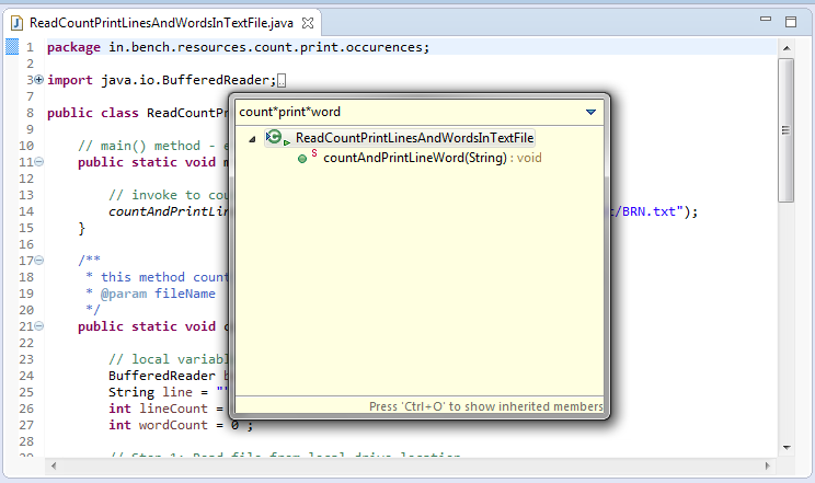 CTRL SHIFT T used to search all Java type files Open Type CTRL SHIFT R used to search all types of files Open Resource CTRL H opens dialog box which provides number of options Search. Pressing ctrlo again extends the search scope to the complete class hierarchy. Now if we need to step into a method we use F5 to step into the method.